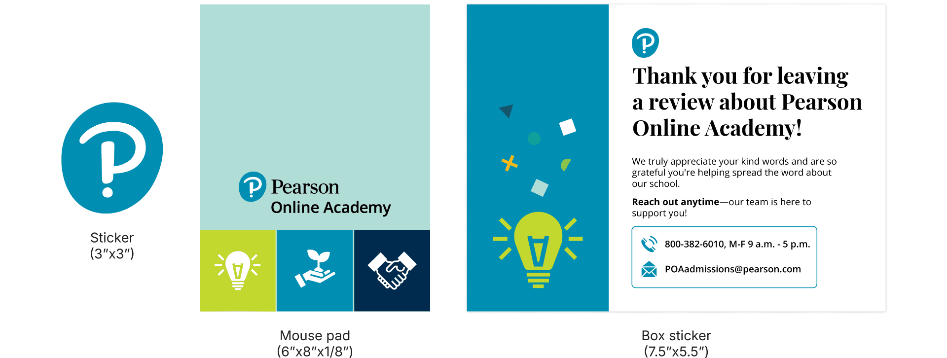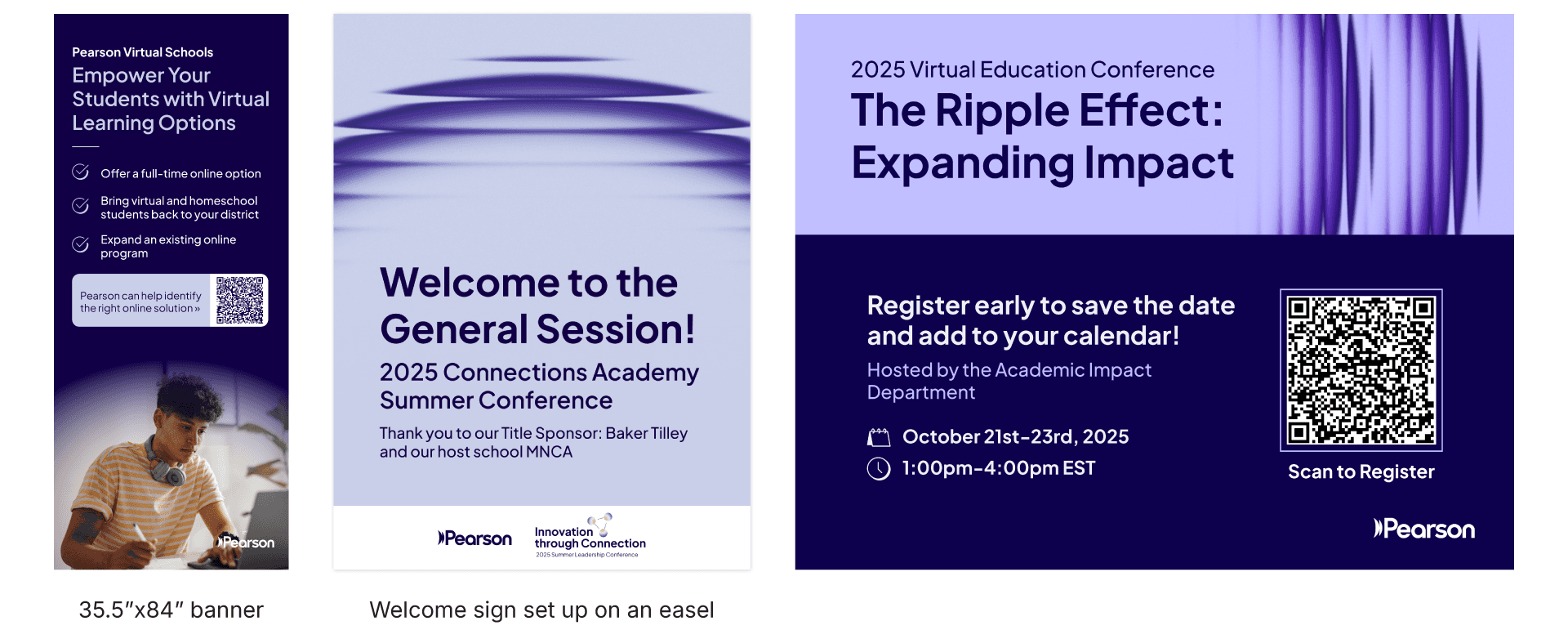 I managed the design and production of brand materials across digital and physical formats, ensuring visual consistency and presence for Pearson, Pearson Online Academy (POA), and Connections Academy. My work included collateral such as eGuides, one-pagers, and presentation decks, alongside tangible items like event signage, welcome kits, and custom apparel.