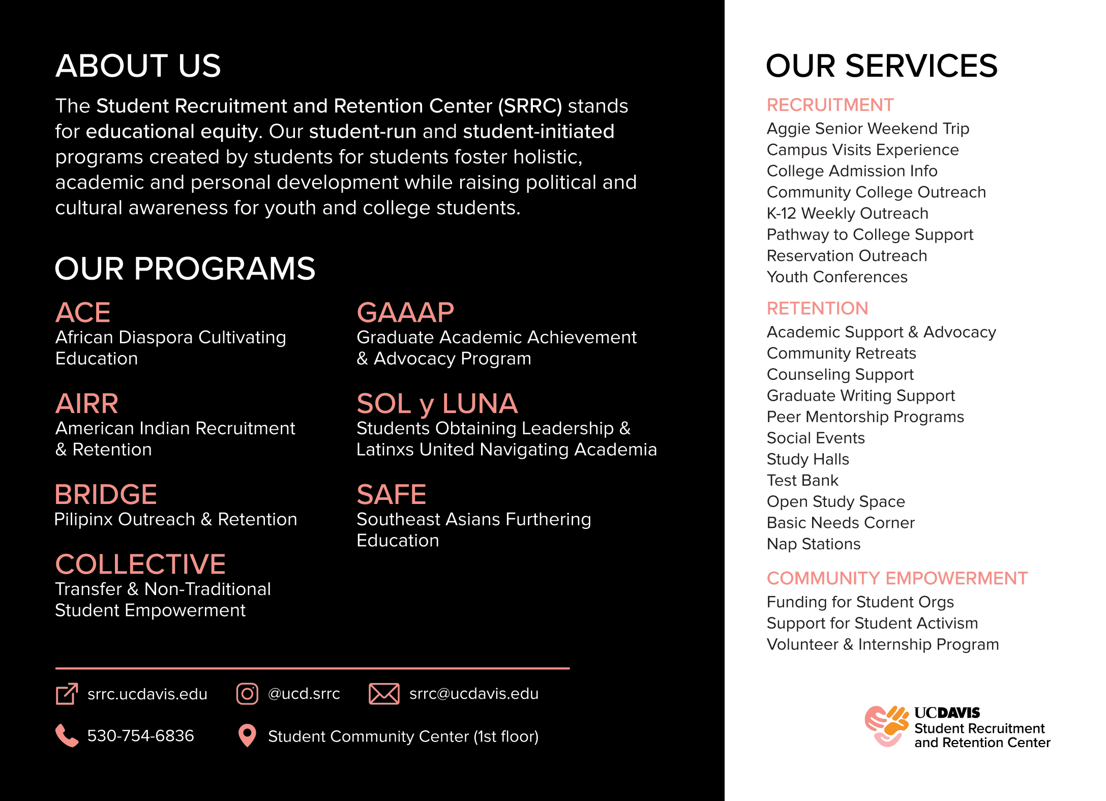 A revamped postcard designed for tabling and other marketing purposes to inform visitors about the mission and services of the SRRC (Student Recruitment and Retention Center).
