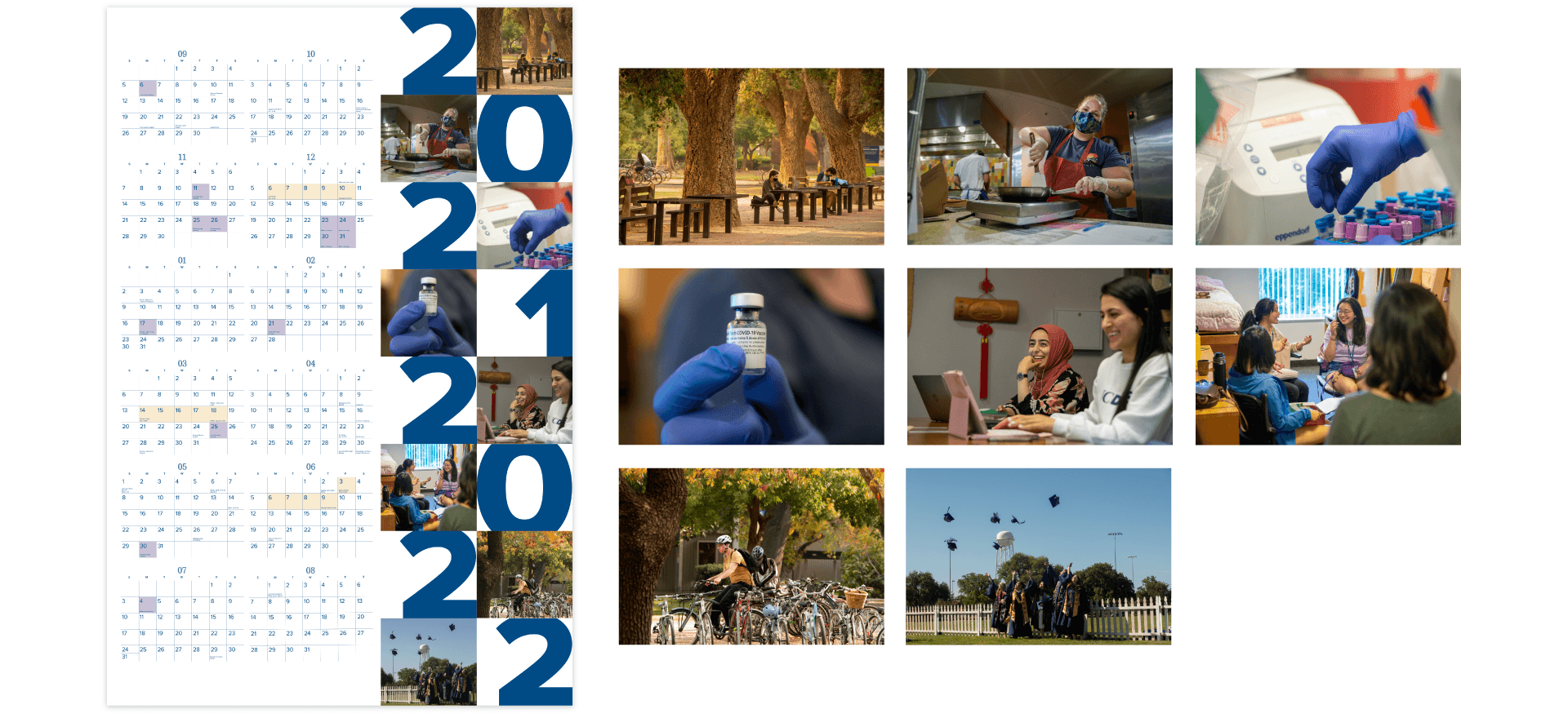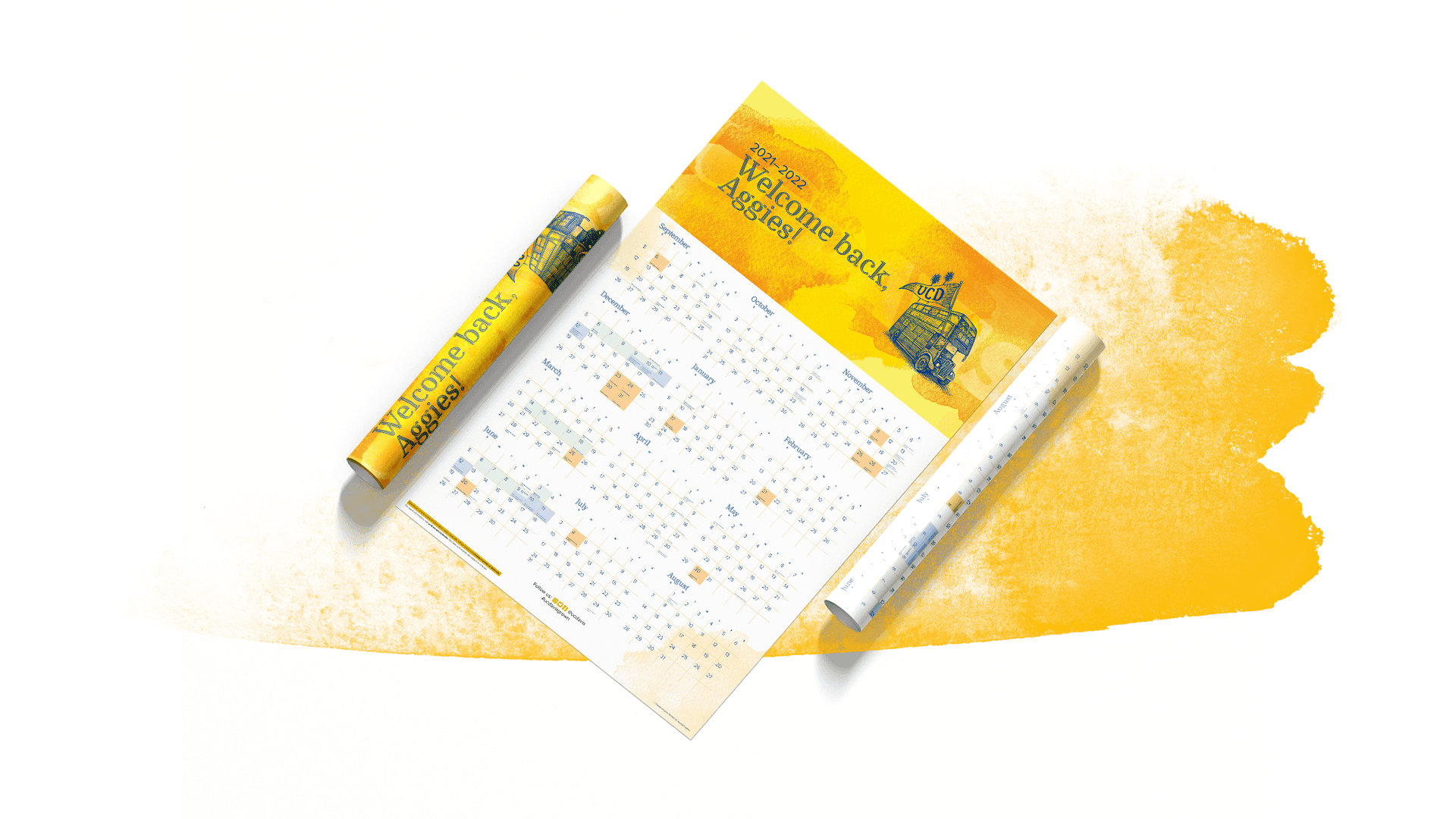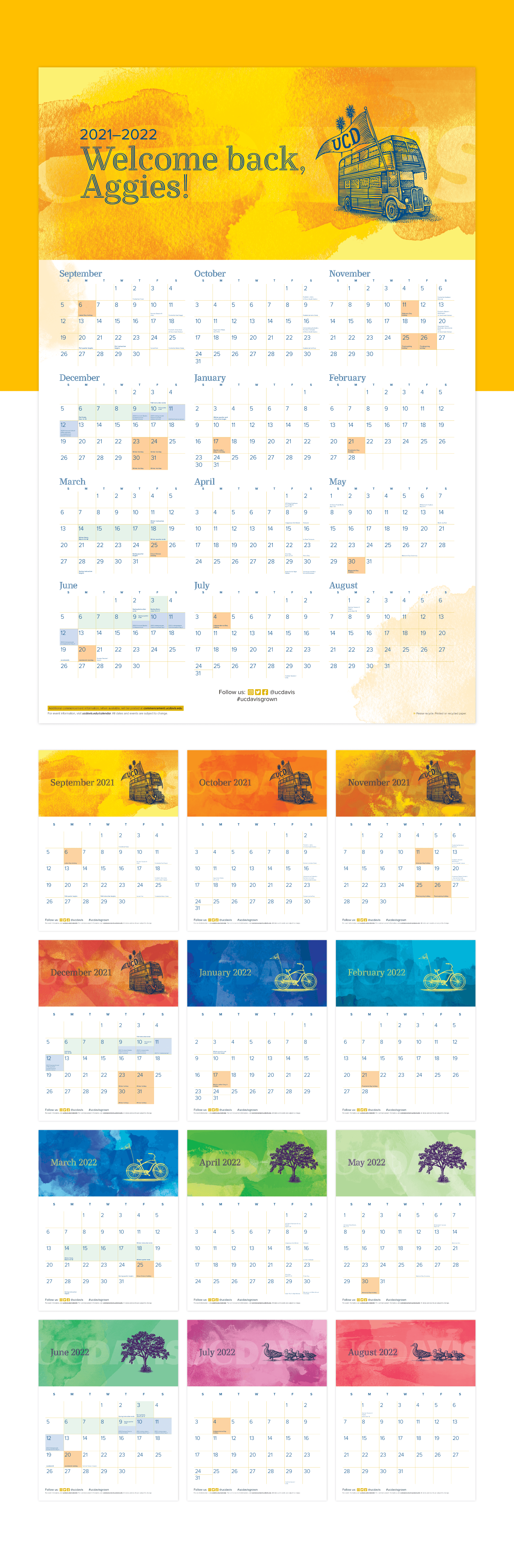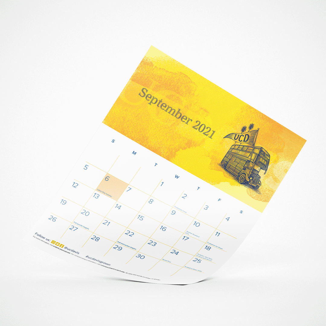 With remote learning and reduced campus operations for a year and a half due to COVID-19, the official UC Davis 2021–2022 poster calendar and downloadable monthly calendars were carefully curated to welcome back students to in-person instruction and campus life full of engaging opportunities.