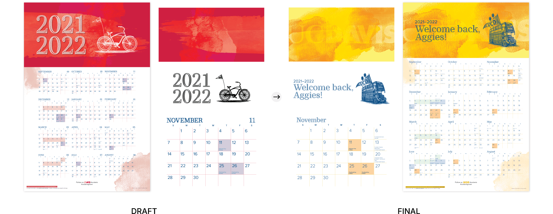 Consulting with the Art Director, Brand Manager, Project Manager, and Director of Brand Management and Marketing, we collectively felt going in this direction allowed the UC Davis brand to really shine through and produce a product that people would be eager to purchase and display.