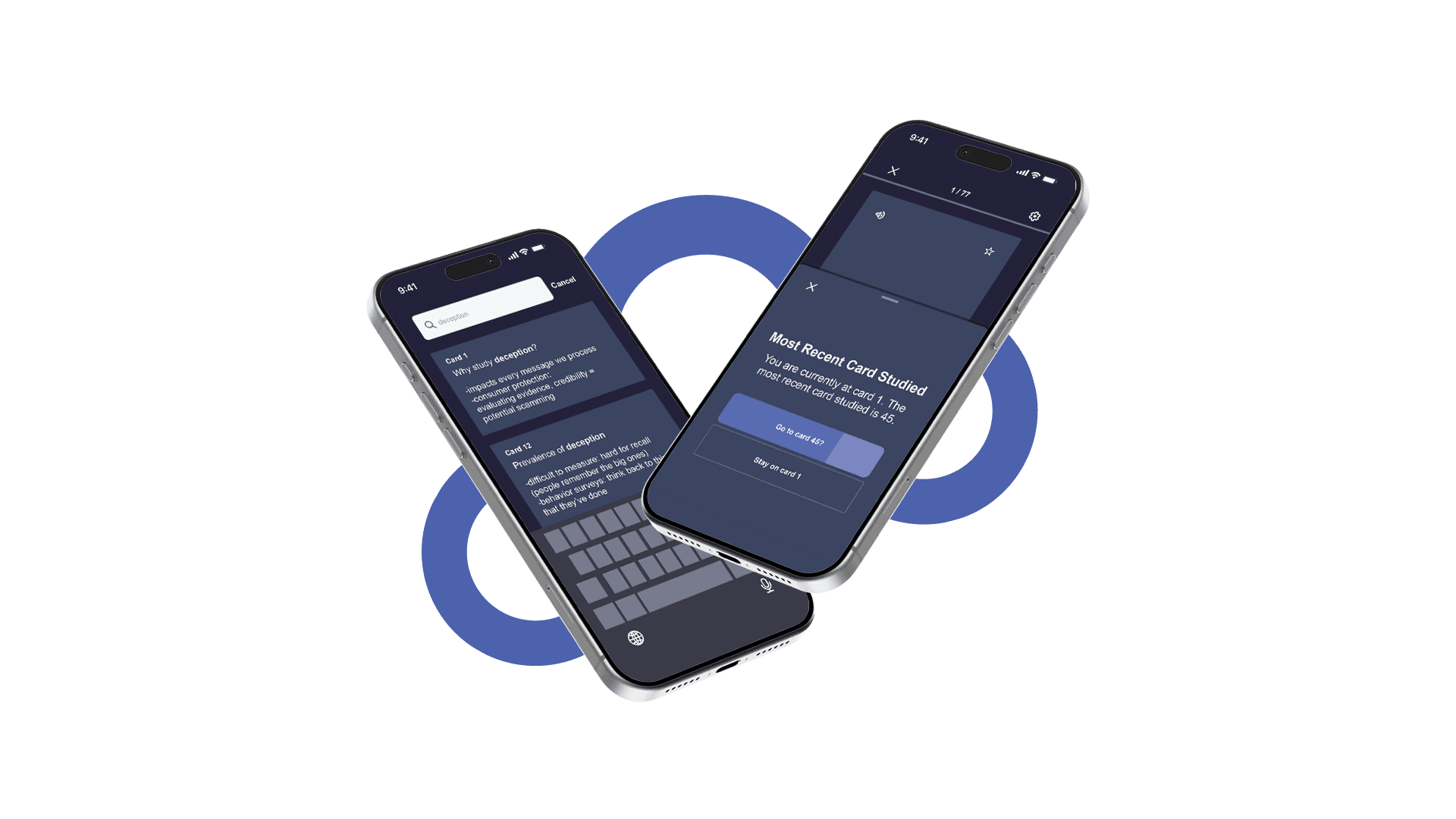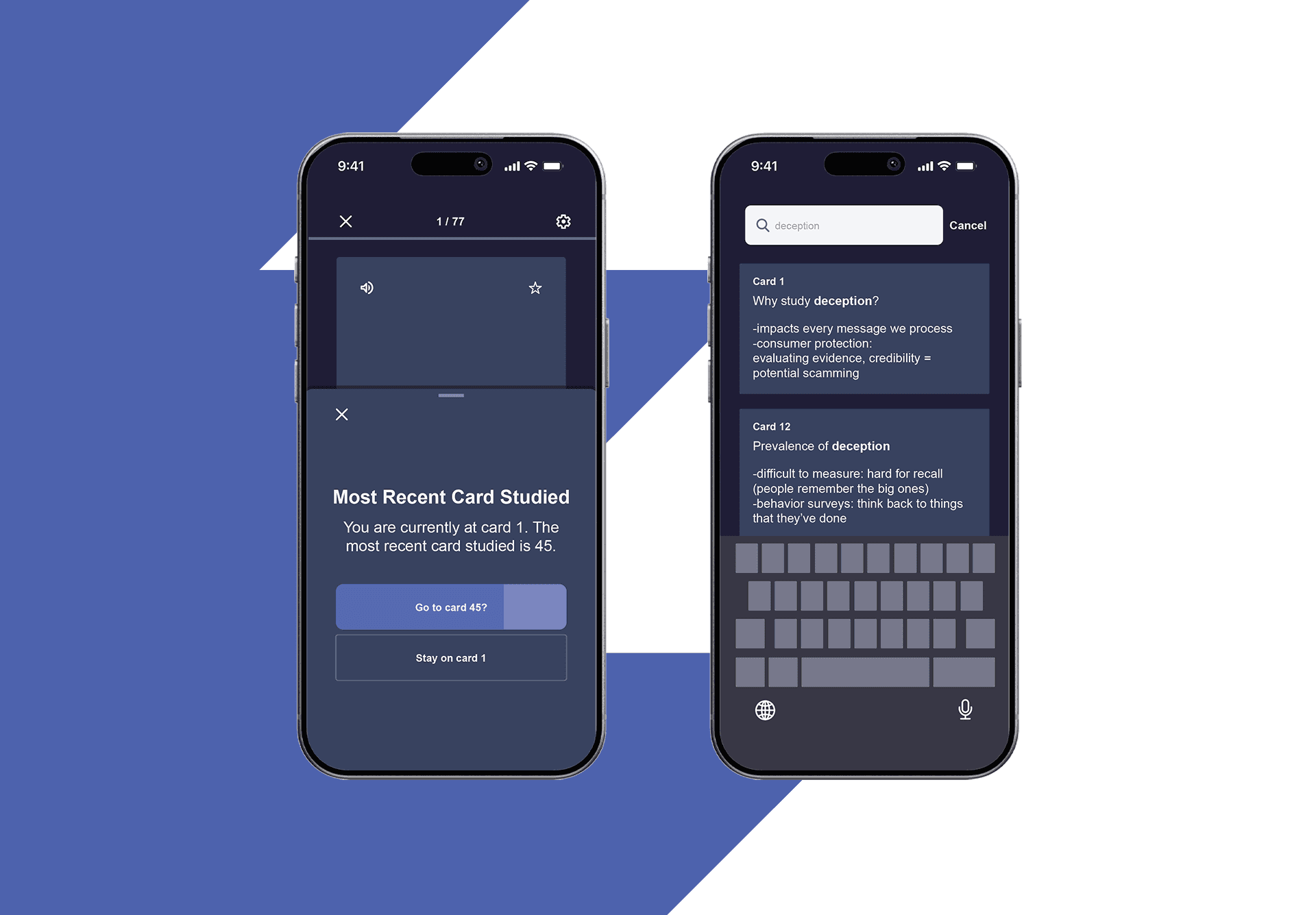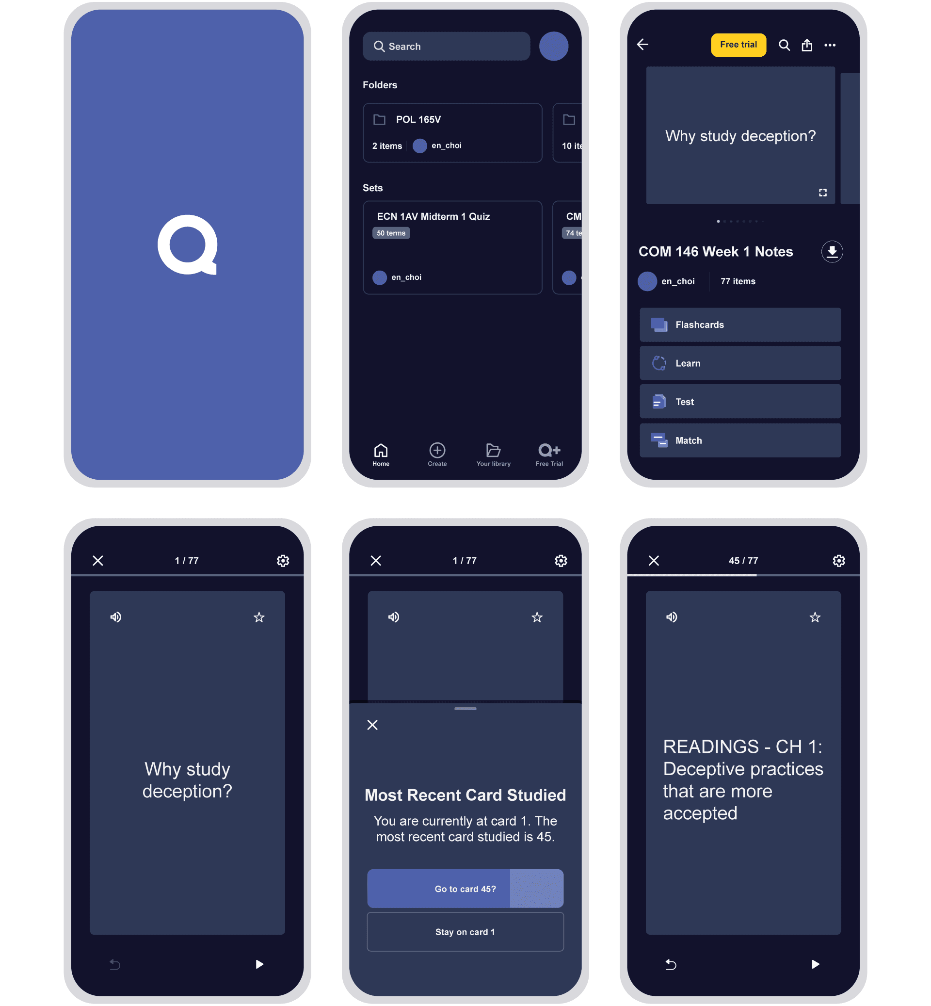 If someone switches devices during a study session, a pop-up will appear on the device they are now studying on - “Most Recent Card Studied: You are currently at card (#). The most recent card studied is (#). Go to card (#)?” If the set is being studied for the first time, the pop-up will not appear.